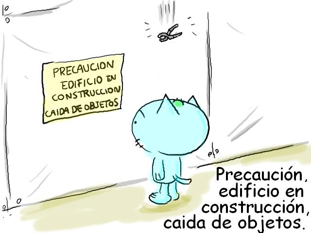 「建設工事中、落下物注意」 (プレカウシオン エディフィシオ エン コンストゥルクシオン カイーダデ オブヘトス)